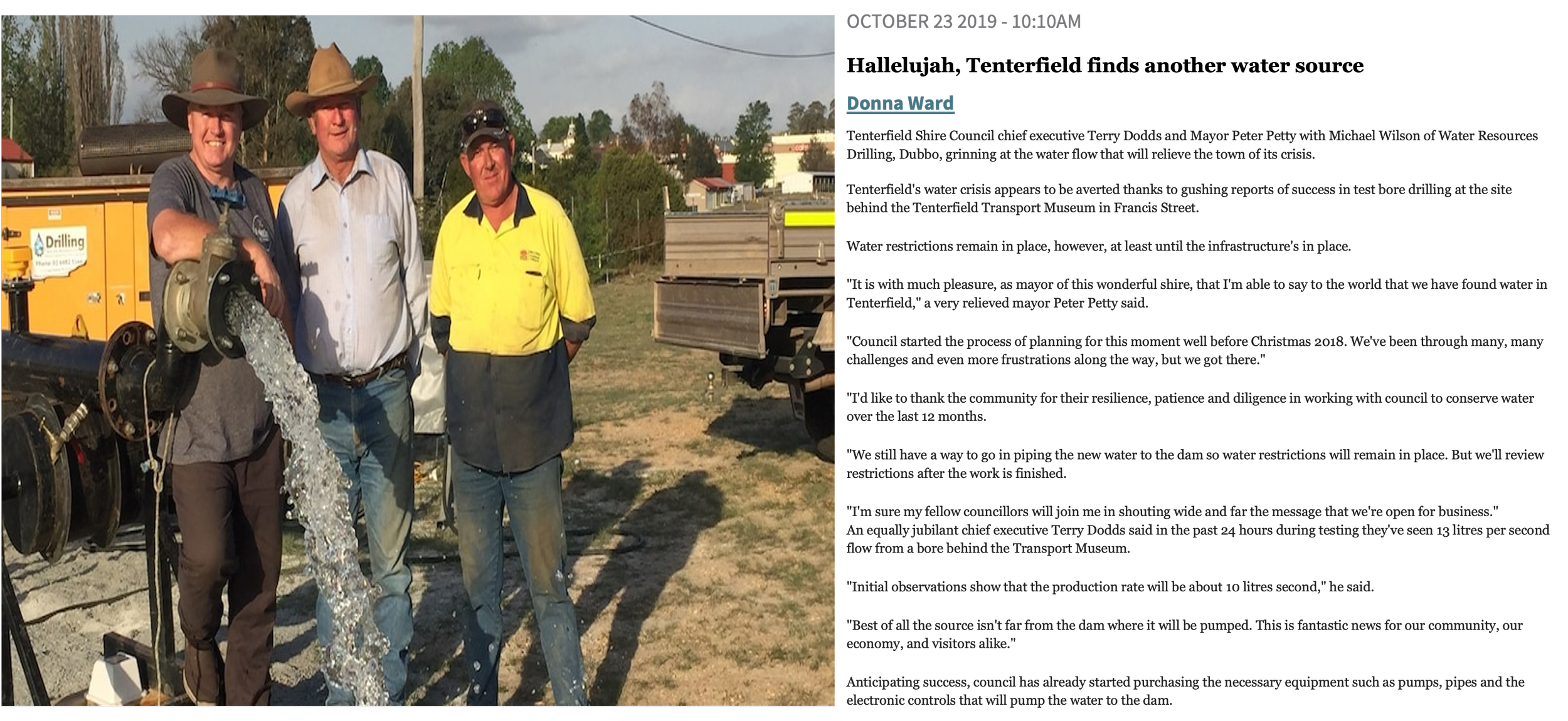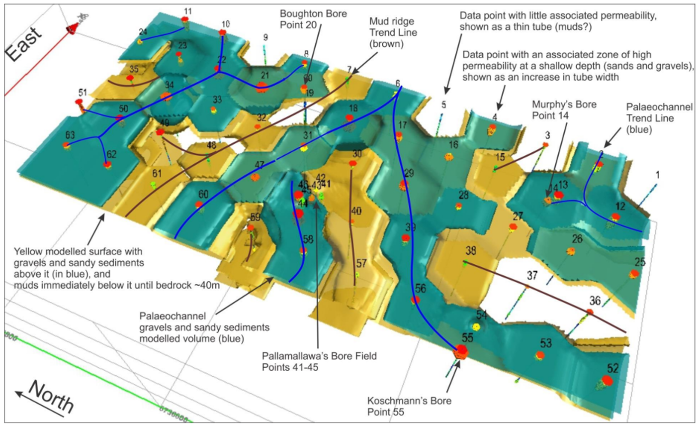 In this study, the town of Tenterfield, New South Wales, Australia had been plagued by a four-year-long drought. Estimates indicated that the town had only 80 days of water left in its storage dams before the town would be left without any water. The town council had drilled eight wells to try supplement the water supply, but all of them had failed. A GeoView affiliate geo-consulting firm based out of Australia was called in to investigate the aquifers in the area surrounding the town in hopes of locating alternative water supplies. The area was surveyed using the GeoView system, and all the aquifers under the town were delineated. Wells drilled into these aquifers produced 30 cubic meters per hour of water for the town, averting a crisis for the residents of Tenterfield. Here we see the results of the investigation of the Tenterfield surrounding area. The data indicated that the groundwater in the area was contained within paleo channel formations. These paleo channel formations were targeted for the placement of the successfully yielding groundwater supply wells for the town.