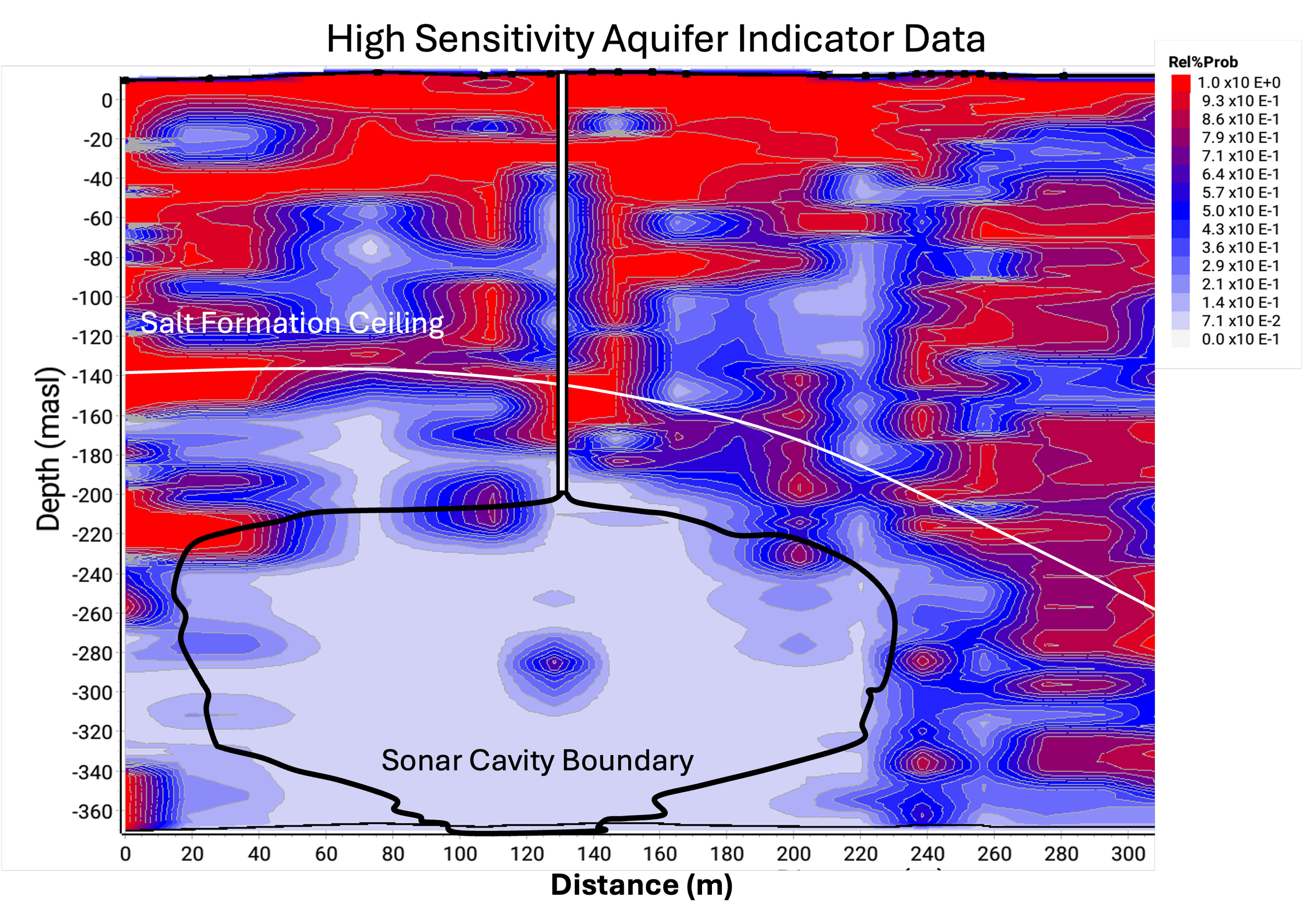 To accomplish these objectives, the methodology of absence of ES response data in unsaturated, no porous salt formations was used to delineate the salt formation interface. Additionally, the same methodology was employed to delineate the brine filled cavity, which cannot produce an ES response due to the lack of a porous medium within the cavity in which an ES conversion can occur. The high gain aquifer indicator data set was used to test this hypothesis. A comparison between the known well log data for the salt formation interface and the sonically determined cavity boundaries, and the collected ES high gain aquifer indicator data show a strong correlation between the data sets, proving evidence that the ES technique is capable of delineating a brine filled cavity within a salt formation.
