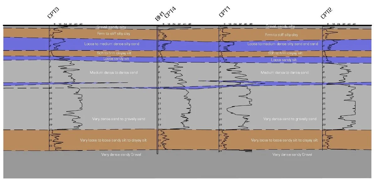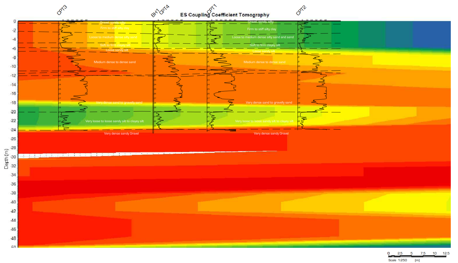 The high resolution GeoView data also indicated that the upper eight meters of soft, unconsolidated soils presented the highest risk of liquefaction, thus validating the CPT data both in depth and in lateral resolution.