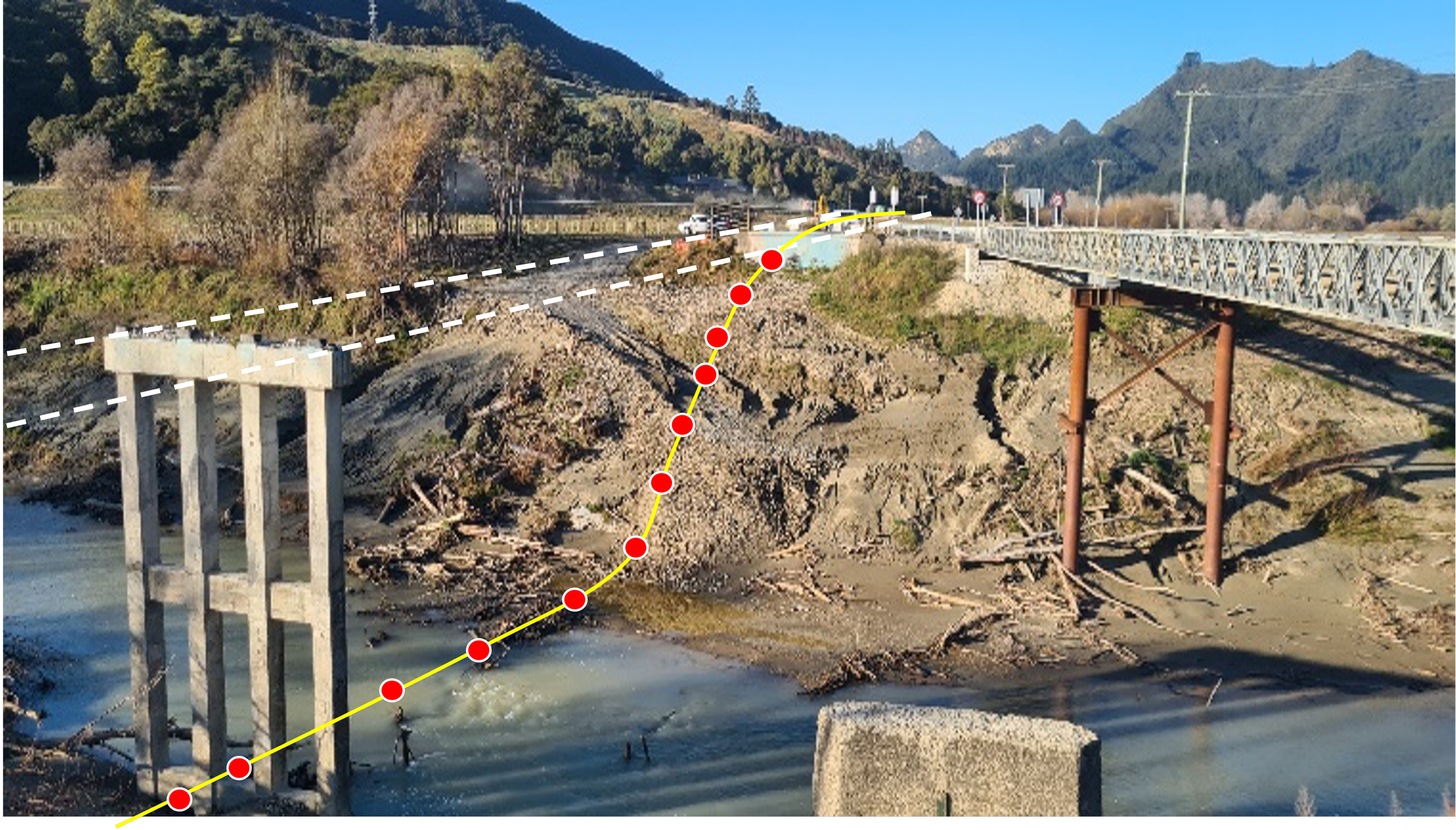 This geotechnical study, located in Poverty Bay, New Zealand, was conducted to evaluate the subsurface geological structures under the construction site of a new bridge being built to replace a bridge that had been washed away. The aim of the study was to collect seismoelectric sounding data under the bridge area in order for civil engineers to evaluate and compare the data against cone penetration test and well logs collected on the site. The reason that the GeoView system was used on this site was due to access issues that restricted other more traditional geotechnical methods, such as CPT from accessing the site. The GeoView sounding data served as a low-cost alternative to filling the geological information between CPT and core drill locations, providing the client with high-resolution information in areas of the site that would not have been possible with other more traditional equipment. Here we can see the construction site with the sounding points overlaying. 76 soundings, both on land and over the water was collected by two crew members over the course of two days using handheld seismic source equipment. The data was processed to a depth of 50 meters below surface level.