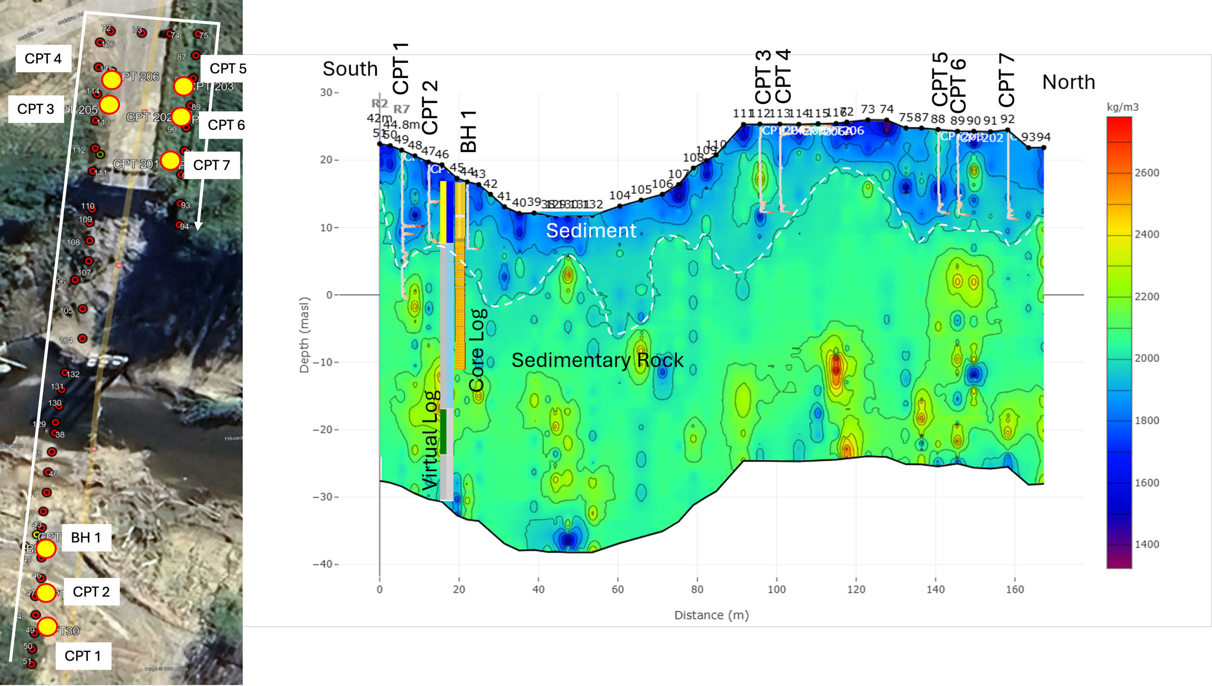 Here we see the survey layout under the bridge section. The sounding locations are marked in red and the CPT and core drill points are marked in yellow. The section plot shown is for the white profile shown on the map and represents the density in kilograms per cubic meter of the formations under the survey line. On the section plot, the CPT data for all the CPT survey points are overlain, as well as one core log. The CPT data indicates the depth to consolidated rock. The density data shows a clear interface between the unconsolidated sands and the consolidated sandstones under the site. When compared against the CPT and core log data, we can see a high degree of correlation between the data sets.