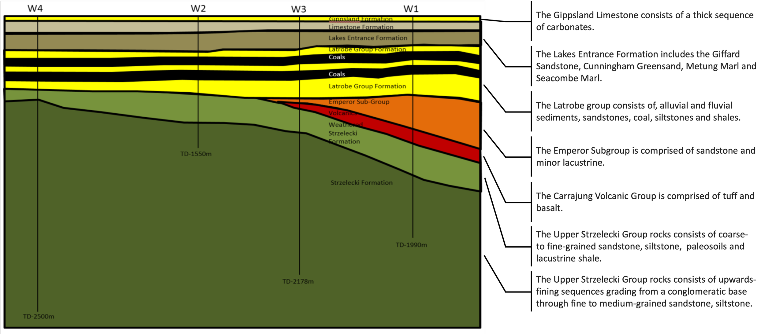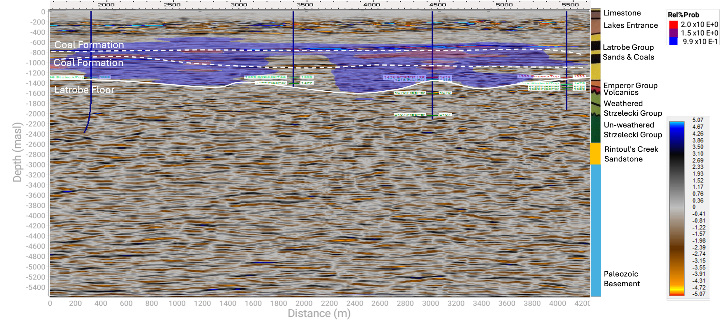 The electric field data shown here clearly defines the Latrobe formation, with clear indications of the two coal seam horizons within it.